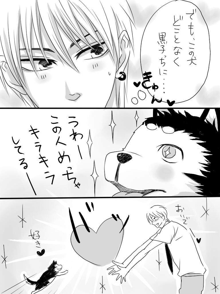 最初は黒子が犬の写メとっていて、それを黄瀬に送ったら、『今撮影なんすよーなんすかその可愛いワンちゃんww是非黒子っちとのツーショットをお願いするッス!!』とか返ってきて、-で黒子が『黄瀬君のモデルっぽい写メを送ってくれたら考えます。』っておくって(※私の中で黒子はモデルの黄瀬が好き)写メが送られてきて、そして、火神に犬とのツーショットを撮ってもらって送るっていうやつを考えていたんですけど。。。