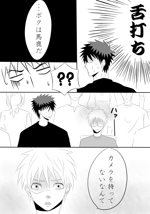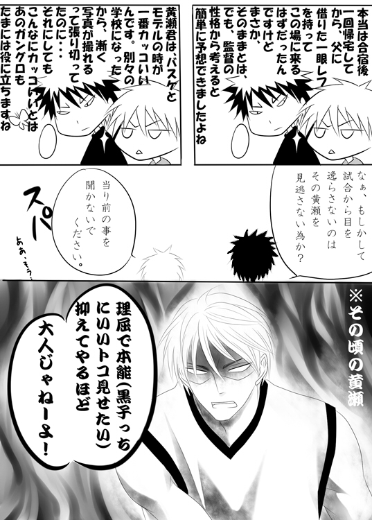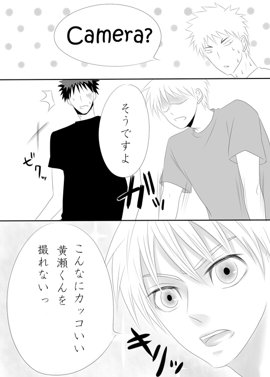 左から1枚目~お手数ですが、1ページづつ開いてご覧くださいm(__)m とりあえず火神はツッコミポジで 黒子の愛はどこか変わっていて 黄瀬の愛は一直線です。 今回の一番頑張ったところは、言わずもがな最後の黄瀬くん。 パソコンで書くと背景をうまく書けなくてがっかりします。 アナログだと人物のペン入れがうまくいかないし、 これってマンガを書かない方がいいのかしら??